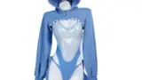 この衣装は、薄手で伸縮性のあるニット素材を使ったタイトミニのワンピースです。ボートネックが鎖骨まわりをすっきり見せ、長めのベルスリーブが手首へ向かってふんわり広がることで女性らしいラインを演出します。丈は太もも中ほどのミニ丈でウエストからヒップを強調するフィット感が特徴。薄手生地のためわずかに透け感があり、インナーや細ベルトで着こなしの変化を楽しめます。裾は波打つメロー仕上げでさりげない装飾性があり、シンプルながらボディラインを美しく見せるため撮影やデート、イベントのコスプレ風コーデに適した一着です。