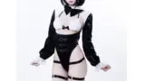 この衣装は教壇を連想させる“先生風”モチーフを、大胆なカッティングで再解釈したワンピースです。胸元は深いスクープネックと両肩のカットアウト(ビブ風白パネル)でハルターネックのような印象を作り、首元には細いネクタイをチョーカーのように合わせる構成です。ボディは薄手のストレッチジャージで全体をタイトに包み、胴部に配した金ボタンが軍服的なアクセントになっています。袖は七分丈で白いカフスをあしらい、裾は前後に細長いテールを残しつつ両脇が股上まで大きく開くハイレグ/サイドスリット設計です。モデル着用写真ではハイカットのショーツやシアーなタイツ(開檔タイプ)と組み合わせており、ドレスの伸縮性と肌のラインがそのまま見えるつくりになっています。マネキン画像では前後のバランスやスリットの位置が確認でき、別売りのオープンクロッチタイツとのセット提案も見られます。