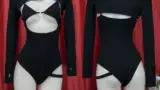 全身をタイトに包むボディスーツに、短めのケープレットと前面に垂れるロングパネルを組み合わせた一着です。薄手のシースルー素材が身体のラインを透かし、中央の光沢あるサテン風パネルが縦の視線を引き締めてくれます。胸元は両サイドが大きく切り込まれたカットアウト仕様で、バストラインを強調するカッティングになっています。肩はパフスリーブで袖口に細かなフリルが施され、太もも位置にも同様のフリルガーターがアクセントとして付いています。ウエストにはチェーンベルトが掛かり、ハートモチーフと十字架チャームがポイントになっています。ヘッドバンドに重ねる薄手ヴェール、首元の十字架ネックレス、そして手元を覆うグローブで上下のバランスを取っており、宗教的モチーフとランジェリー的な要素が重なり合うデザインです。伸縮性のある素材でフィット感があり、縫製は肩周りや腰回りにしっかりしたステッチが見られるため着用時のラインが安定します。