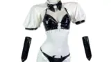 柔らかくストレッチ性の高いシアーメッシュを主体としたミニワンピースです。バストは薄手の生地を中央で寄せて立体感を出すバンドル状の処理で、ワイヤーや厚パッドを使わず布の寄せでフォルムを作っています。胸下とウエストに施されたクロスラップは大胆なカットアウトを生み、中央に配したゴールドの装飾ビジューがアクセントになっています。肩はホルターネック兼オフショルダー風に見せられるドレープ仕立てで、背面はタイトに絞ることでボディラインを強調します。スカート部分は側面のシャーリングで微妙なギャザーを作り、付属のタンガでセットを完結させる構成です。縁は細いバインディング処理で整え、透け感と締め付けを両立させたデザインです。