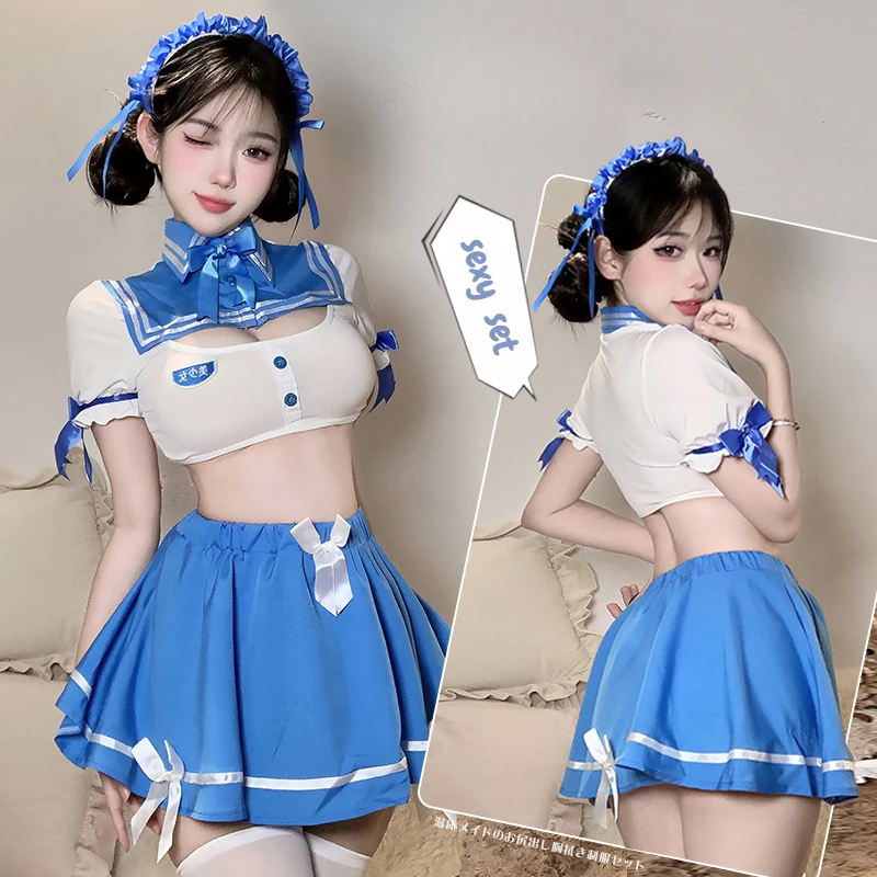 この衣装はセーラーをモチーフにしたフェミニンなコスチュームです。この衣装は胸元を強調するクロップドトップと、デコルテを覗かせるセーラーカラーが特徴で、短めのパフスリーブにリボンが結ばれたディテールが可愛らしさを演出します。この衣装はウエストが見えるミニ丈のフレアスカートで、裾にリボンとラインのアクセントが入り歩くたびに揺れる動きが出ます。この衣装は軽やかな化繊素材にやや光沢のあるリボン使いでまとめられ、胸元のボタンやワッペン風の飾りが遊び心を添えます。この衣装は付属のヘッドバンドやニーハイと合わせると統一感が出て、撮影やイベント、パーティー、SNS用のスタイリングに向くデザインです。
