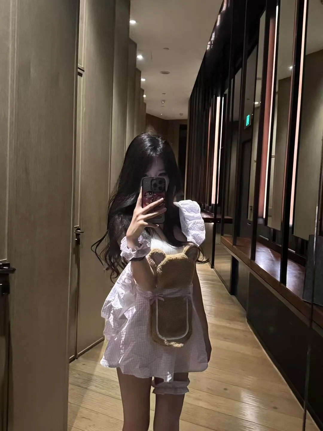 薄ピンクのギンガムチェック生地をベースにしたエプロンワンピースです。胸元と前ポケットに配されたベージュのプードルファー風パネルが特徴で、丸みのある耳のモチーフでぬいぐるみ感を強めています。肩と袖口には細かなフリルをあしらい、襟元は深めのVラインでインナーが見える設計になっています。ウエストはリボンで軽く絞る仕様、スカートは短めのAラインで脚をすっきり見せるシルエットです。付属のヘッドピースとレッグガーター風の小物がセットされ、素材のコントラスト(さらっとしたコットン風ギンガムとふわふわのファー)が可愛らしさと遊び心を演出します。コスプレやルームウェア、撮影用のスタイリングに向いたデザインです。
