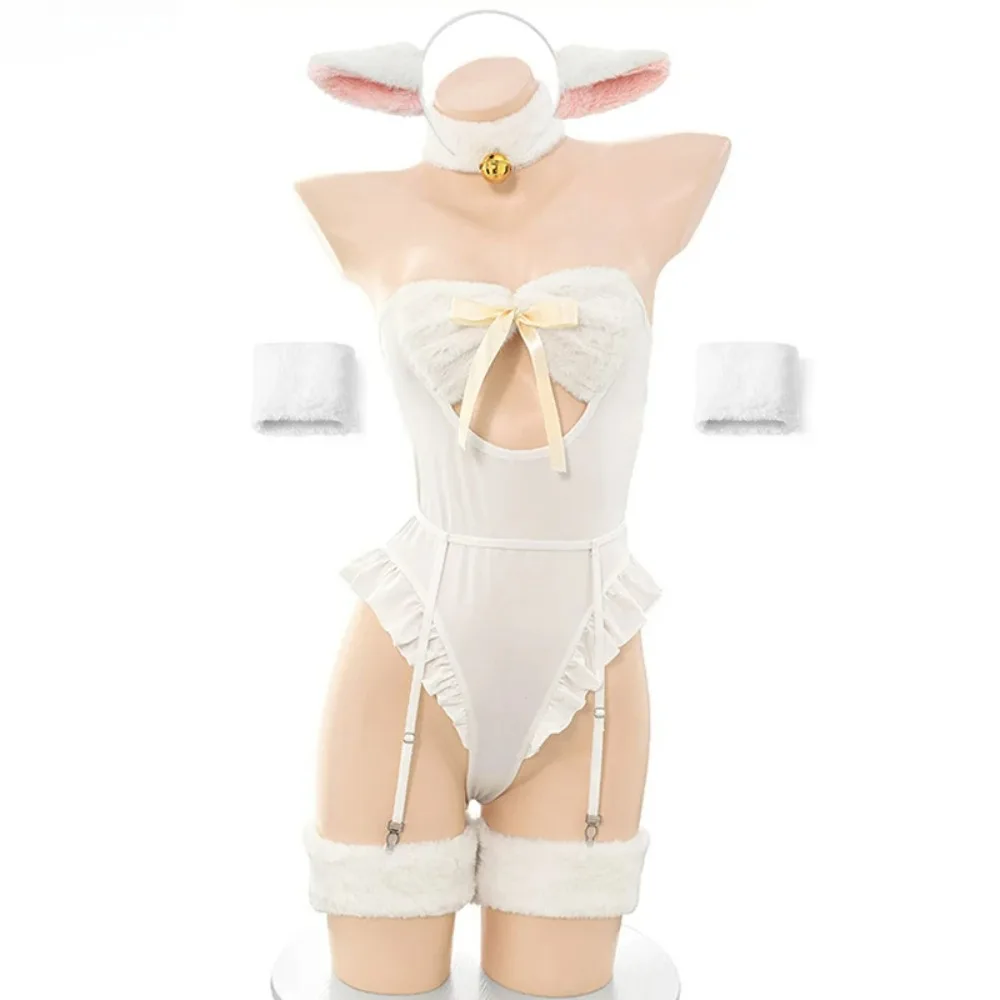 この衣装はうさぎモチーフのランジェリー風ボディスーツセットです。ストラップレスのハート型バストはフェイクファーで縁取りされ、中央のリボンで切り込みを作ったオープンバスト仕様。ウエストのフリルペプラムとハイレグカットが脚線を強調し、バックはホック留めとポンポンしっぽで遊び心を演出します。調節可能なガーターストラップ、取り外し可能なファーカフス、イヤーヘッドバンド、ベル付きチョーカーが揃い、伸縮性のあるソフト素材が身体にフィットします。コスプレ撮影やテーマパーティー、プライベートなイベントにおすすめの一着です。