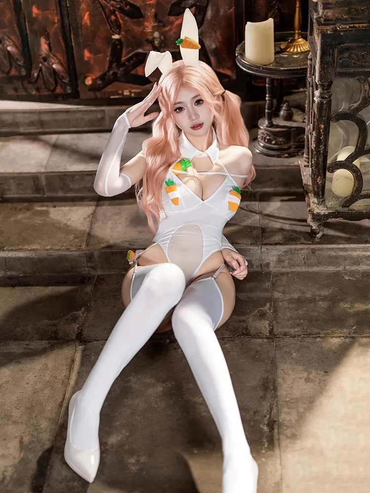 この衣装はウサギをモチーフにしたボディスーツ型のコスチュームで、魅せるラインを強調した大胆なデザインが特徴です。V字に開いた胸元と両脇の大きなカットアウトでハイレグに近い長さを作り、ボディはタイトなシルエットで身体にフィットします。素材は伸縮性のある光沢感のある生地と部分的に透けるメッシュを組み合わせ、胸部と股間にはにんじん型の小ポケット風アクセサリーが付いてポイントを添えます。肩はストラップ+付け襟のネックライン、腕にはロングのアームカバーがセットになり、後ろはレースアップとふわふわのしっぽ飾りでフィット感の調整が可能です。ガーターストラップでニーハイを留められ、ヘッドバンドのウサ耳と合わせればキャラクター性が際立ちます。撮影会やコスプレイベント、プライベートパーティーなど、写真映えを重視したシーンに特におすすめの一着です。