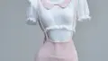 この衣装はピンクと白の配色で構成されたナースコスチュームです。胸元はストラップレスのチューブトップになっており、バスト上縁に白いフリルが施され、中央に十字のワッペンが配置されています。ウエストはコルセット風の切り替えでタイトに仕上げられ、前面に並ぶ白いボタンが装飾されています。裾はミニ丈で前中央に小さなスリットが入り、太もも上部まで肌が露出する設計です。サイドには白い切り替えパネルが入り、背面は大きく開いており肩・背中が露出します。付属品として同色のナース帽、チョーカー風ネックアクセ、ピンクの聴診器風小物が確認できます。太ももにはガーターストラップで繋がったニーハイが組み合わされ、ストラップと裾、ストッキングの間に肌の見える“間”が生まれています。素材は光沢の少ないマットな質感で身体に沿うシルエットを作る構造です。全体として肩と背中を露出させつつ胸部とウエストを強調するデザインで、撮影やコスプレイベント、プライベート撮影向けの衣装です。