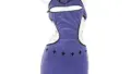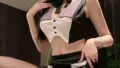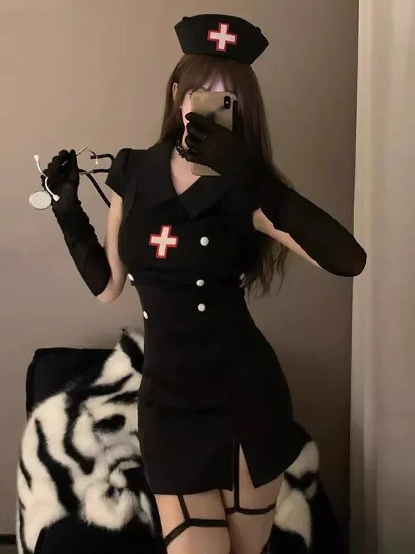 ナースモチーフのタイトミニワンピースです。胸元に十字のワッペン、胸下から腰にかけて並んだダブルボタン風の切り替えでコルセットのようにウエストラインを引き締める構成になっています。襟は広めの台襟、袖は軽くパフの入ったショートスリーブで、ヒップラインに沿うボディコンカット。左脚に入ったスリットとガーターストラップ風の装飾で脚のラインを強調します。付属のナースキャップやロンググローブ(シースルータイプあり)、くるみボタンなどでコスチューム性を補強。生地は伸縮性のある合成繊維と思われ、フィット感は高い反面、丈が短くタイトなので可動性は制限されます。