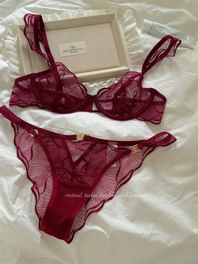 この衣装はワインの深みある色味が特徴のランジェリーセットで、透けるメッシュに葉脈のような刺繍風の模様が入ったエレガントな佇まいです。 この衣装はアンダーワイヤー入りのカップがややハーフカップ寄りのデザインで、バストに自然な丸みとリフト感を与え、縁はスカロップ(波型)に仕上げられています。 この衣装はショーツがローライズで中央に不透明な当て布を配しつつ、両サイドは薄手の透けパネルで腰まわりを軽やかに見せる構造です。 この衣装は細めのストラップと胴回りの薄いベルトにゴールドのリングや小さな留め具をあしらい、調節機能とさりげないアクセントを兼ね備えています。 この衣装は伸縮性のあるメッシュと滑らかな裏打ちを組み合わせて肌あたりがよく、ソフトなフィット感と程よいホールド感を両立しています。 この衣装は光を透かすことで陰影が美しく出るため撮影や特別な夜、ギフトシーンなどプライベートな場面に映える仕様です。 この衣装は繊細な縫製と金具の仕上げで高級感があり、着用することでフェミニンな雰囲気や大人の遊び心を演出できます。