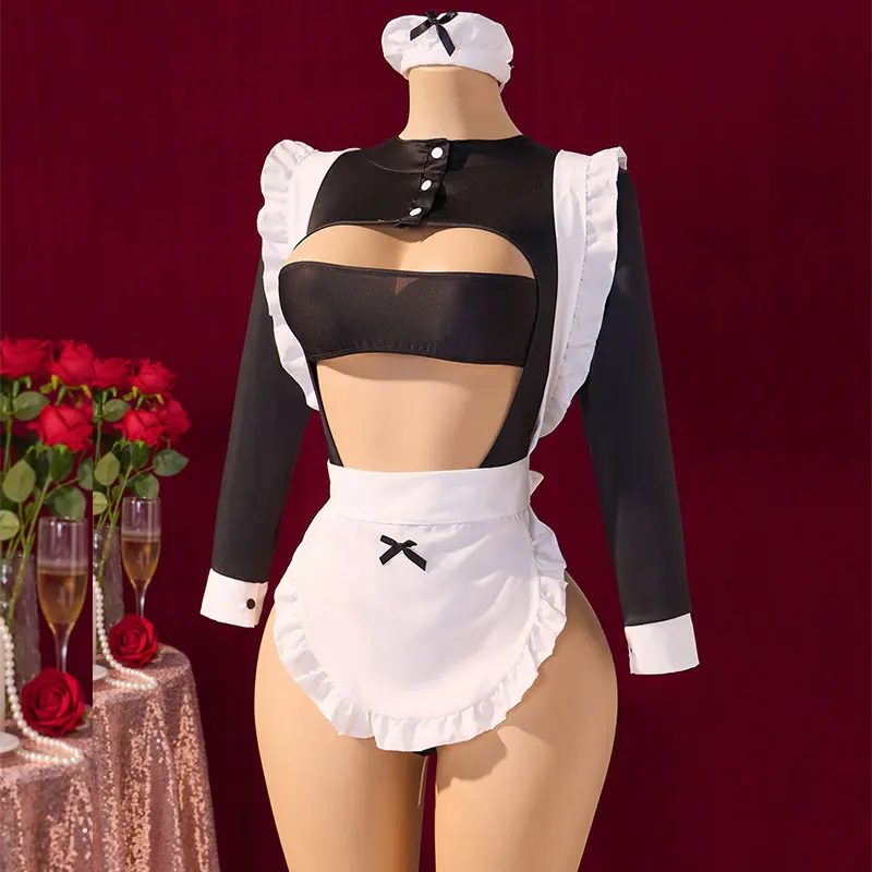 エロティックメイドユニフォーム コスプレ ランジェリー セット オープンブラ ビッグリボンエプロン + ロングスリーブボディスーツとヘッドバンド