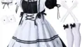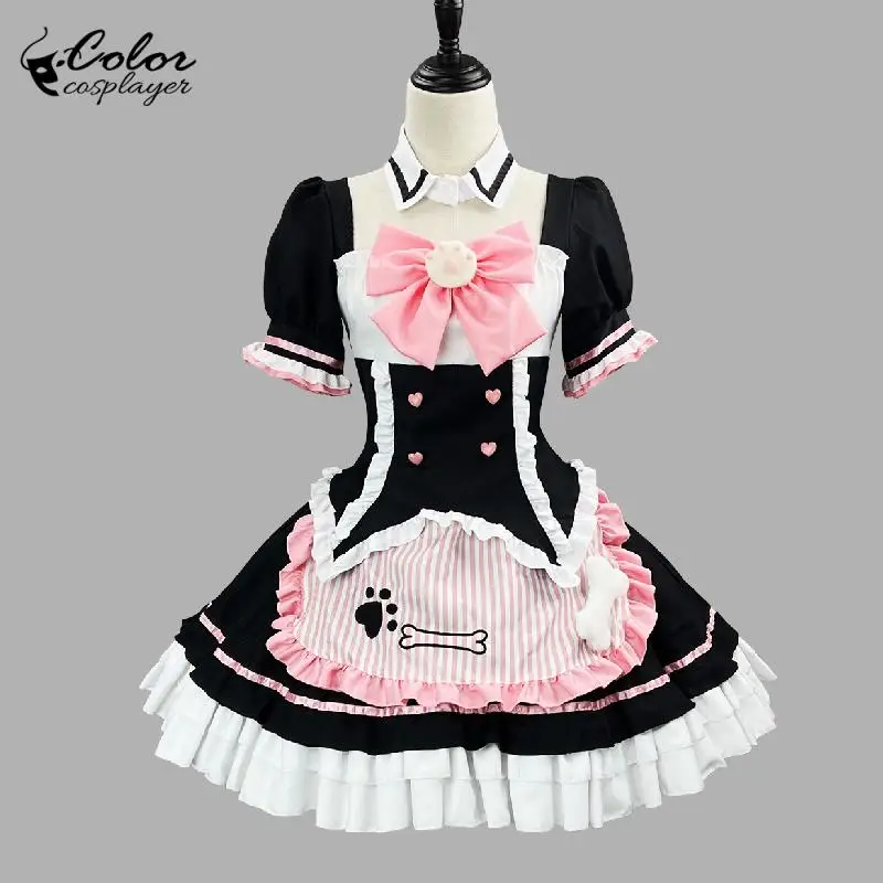 この衣装はクラシカルなメイド服をベースにしたミニ丈ドレスです。ふんわりとしたパフスリーブとスクエアネックが可憐な印象を作り、ウエストを引き締めるコルセット風の切り替えから広がるフレアなフリルスカートが華やかさを演出します。胸元の大ぶりリボンとハート型ボタン、ストライプ柄のエプロンには肉球とボーンのモチーフ、後ろの大きなバックリボンとポンポンが遊び心を添えます。軽やかな生地に光沢のあるリボンやレース縁取りを組み合わせ、背面は着脱しやすい仕様でパニエを入れれば一層ボリュームアップ。ヘッドアクセやニーハイ、手袋を合わせてイベントや撮影、メイドカフェ風のコスプレに映える一着です。