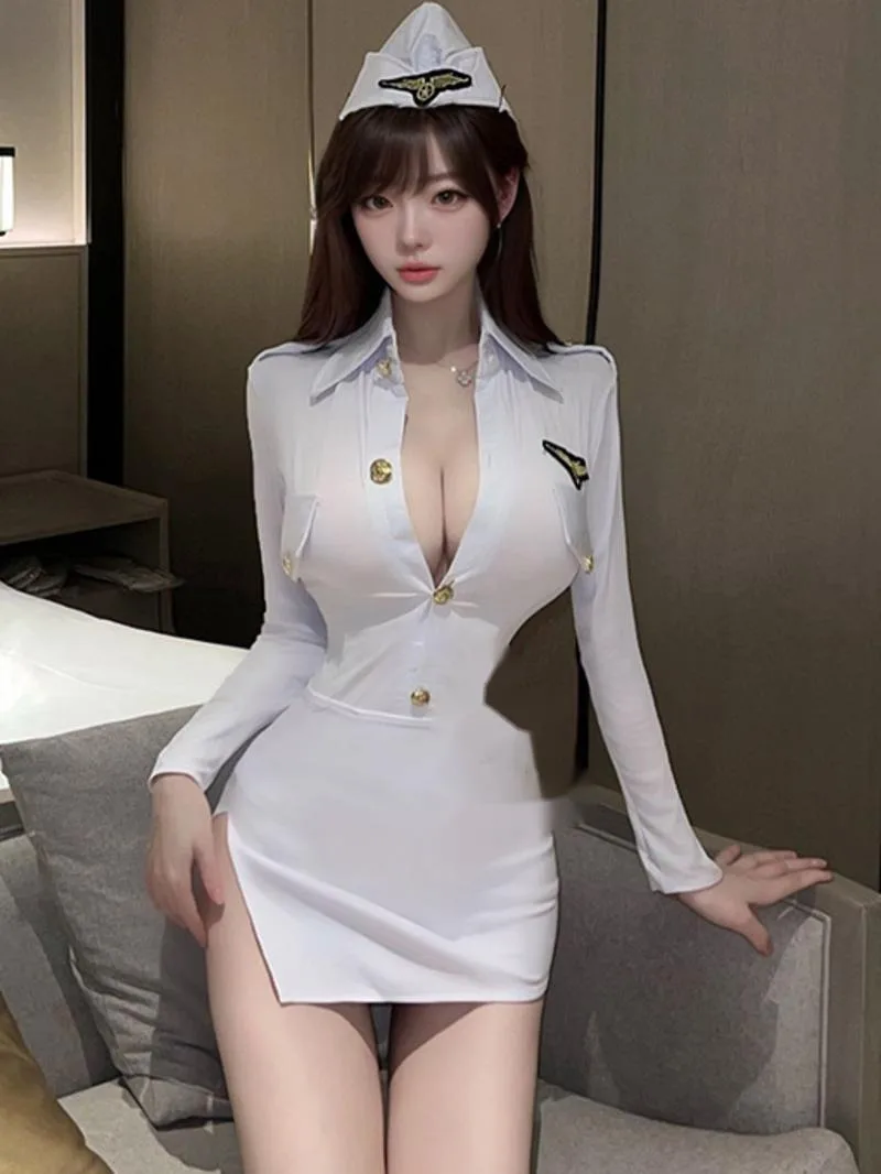 襟付きのシャツ上身頃とミニスカートが一体になった、客室乗務員風のタイトワンピースです。胸元は深いVネックでフロントボタンで留める仕様、ウエスト位置に切替が入りコルセットのように腰をキュッと見せるシルエットになっています。長袖で肩にはエポレットが配され、胸ポケット風のパッチと小さなエンブレムがアクセントです。生地は薄手で伸縮性のある素材感に見え、身体に密着してラインを出す作りです。付属の小さなキャップがセットされ、金属調ボタンやバッジ類でテーマ性を強めています。