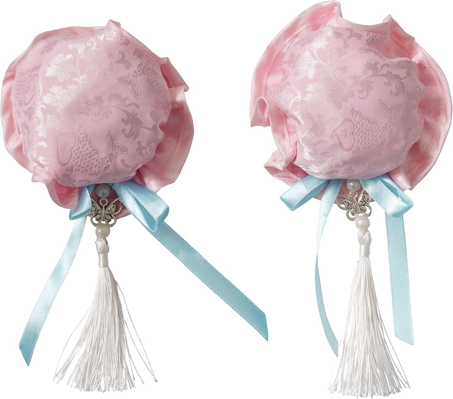 - ピンクのチャイナ生地にチャームやタッセルの付いたお団子カバー。