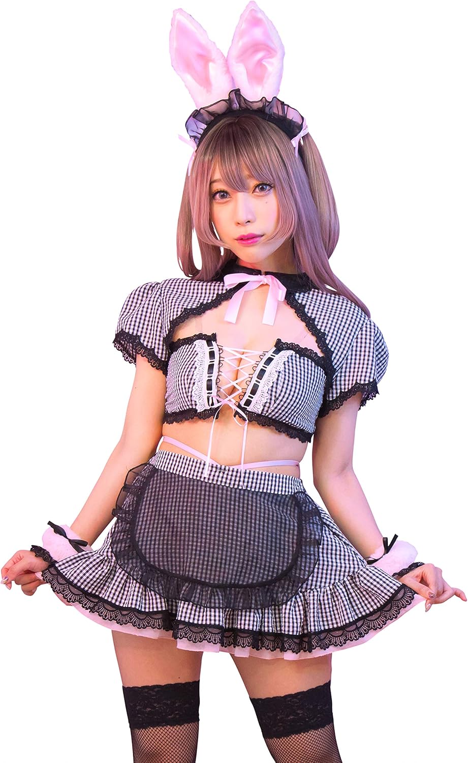 - うさ耳とギンガムチェックがゆめかわいいメイド衣装。