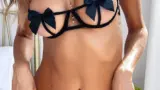 サンタモチーフをさりげなく取り入れたワンピース型のボディスーツです。胴部は伸縮性のあるストレッチ素材で体に沿うフィット感があり、胸元は大胆に開いたオープンバストカットになっています。アンダーにはホワイトのパイピングで縁取りが入り、バストラインを視覚的に強調する構造です。肩紐は細い調節式ストラップで長さ調整が可能、背面は比較的シンプルな仕上がりです。ネックラインと裾まわりにはふわりとしたフェイクファー(ボア)トリムを配して温かみと遊び心を添え、下部はハイレグに近いTバック風のカッティングで脚長効果を出しています。付属のハート形ニップルカバーはスパンコール調の光沢と垂れるタッセルでアクセントを作り、装飾は視覚的な演出に重きが置かれています。軽やかな縫製と薄手のパイピングで軽さを保ちながら、パーティー向けの華やかなルームウェアとして成立する一着です。