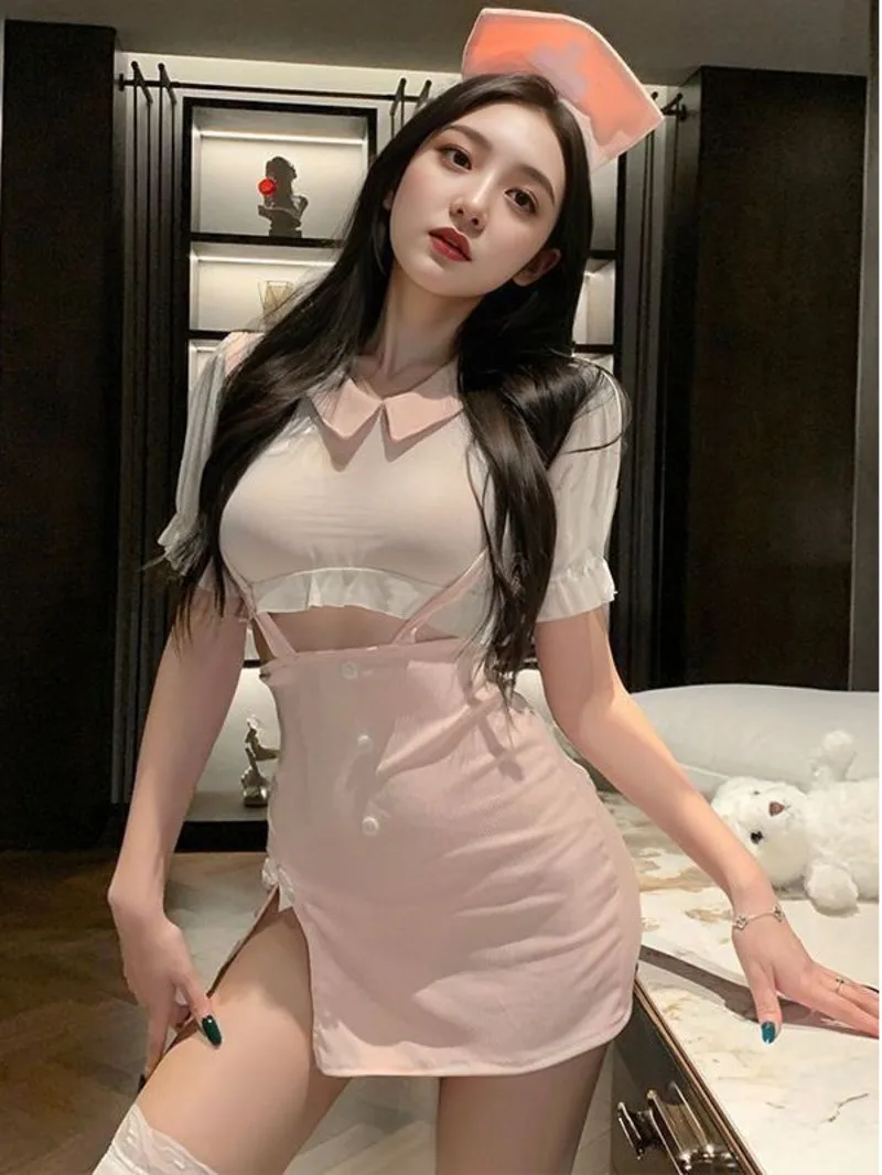 この衣装は淡いピンクを基調としたナース風コスチュームで、甘さとフェミニンさを際立たせるデザインです。襟付きのショートスリーブトップは胸下で切り替えられたクロップ丈になり、裾のフリルがさりげないアクセントになっています。ハイウエストのサスペンダースタイルスカートはミニ丈で前ボタンと両サイドの大きなスリットが入り、バックは大胆に開いたカットでリボンが配されヒップラインを強調します。柔らかく伸縮性のある薄手素材にレーストリムを効かせ、付属のナース帽やニーハイとの組み合わせで撮影やイベント、プライベートパーティーに映える一着です。