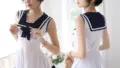 この衣装はセーラーをモチーフにしたミニ丈のコスチュームで、ノースリーブのクロップドトップとレイヤードスカートがセットになっています。トップはセーラー襟と深いVネックにクロスした細ストラップを配し、胸元を強調するデザインで、胸下でリボンと細ベルトがウエストラインを引き締めます。スカートはフロントにスリット風の切り替えと透け感のあるインナーチュールを重ねたフレアシルエットで、ウエストはゴム仕様のため着脱がしやすい作りです。付属のガーターニーソックスは大ぶりのリボンがアクセントになり、胸元のワッペンや襟のライン、複数の小リボンなど細かな装飾でガーリーさも演出します。素材はマットな布地とシアーなチュール、艶のあるリボン使いの異素材ミックスで、撮影やイベント、パーティーやコスプレ撮影会、プライベートなシーンまで幅広く映える一着です。