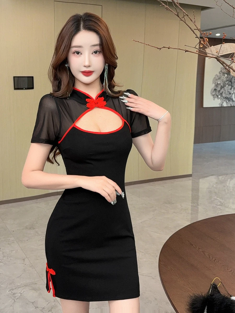 この衣装はチャイナテイストを取り入れたタイトなミニワンピースです。黒地をベースに、写真では襟元やスリット周りに赤または白のパイピングが配されています。立ち襟のチャイナカラーと襟元のチャイナ釦があり、胸元には大きなキー ホール型の開口が設けられています。肩から胸上部および背中上部は透けるシースルー素材で切り替えられ、袖は短めの半袖仕様です。本体は胴に沿うタイトシルエットで、スカート丈は太もも中間付近のミニ丈です。左右のサイドには小さなスリットと飾り紐(チャイナ風の結び目)が配置され、スリット脇で肌の“間”が生まれています。背面は上部のみシースルー切り替え、下部は不透過の生地で覆われており、裾はほぼストレートに仕上がっています。素材感は本体がマットで伸縮性のある生地、切替部が薄手の透け素材でコントラストが作られています。写真にはロングイヤリングや扇子、バラなどの小物が合わせられており、撮影やパーティー、イベント、プライベートでの着用に適しています。
