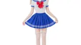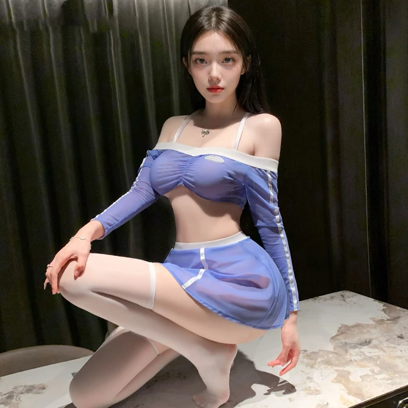 この衣装はオフショルダーのクロップトップとミニスカートがセットになった、スクールテイストのコスチュームです。胸元は中心にギャザーを寄せたデザインで細いホルターストラップとオフショルの白縁がフェミニンさを演出します。薄手のシースルーメッシュ素材で肌のラインが透け、トップはタイトにフィット、スカートはウエストを締めて広がるフレアのミニ丈。袖は長めのフィットスリーブで、縦のコントラストラインが脚長効果を強調します。Tバックのショーツとニーハイを組み合わせれば撮影やコスプレイベント、パーティーで映えるスタイリングが完成します。