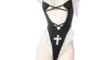 この衣装は、胸下で切り替えたクロップドトップとサイドを紐で結ぶユニークな構造が目を引くコスチュームです。短めの半袖とクルーネックで上半身はフィット感を保ちつつ、背中とウエストが大きく開いたハイカットシルエットが脚線とウエストラインを強調します。薄手のシアー素材とストレッチ性のあるトリム、リング留めのサイドストラップや細いハイレグラインのショーツが組み合わさり、立体的なラインを作ります。網目のニーハイにフリルガーターディテールを合わせたセットで、着脱はサイドリボンで調整可能。撮影やコスプレイベント、プライベートなパーティーで写真映えする一着です。