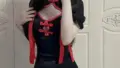 この衣装は透け感のあるホルターネックのランジェリーボディスーツをベースにしたコスプレアイテムです。オープンなバストラインは花モチーフのニップレスとチェーンでアクセントが入り、胴周りは刺繍入りの薄手チュールで繊細な柄が浮かび上がります。サイドに結ぶリボンとラッフルのミニエプロンスカート、背中は大きく開いたバックレス仕様で、光沢のあるパイピングと小さなフリルが女性らしい印象を強めます。撮影やプライベートなイベント、コスプレパーティーで映えるデザインです。