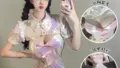 この衣装はナースモチーフのコスチュームで、胸元が大きく開いたミニ丈ワンピースとTバックがセットになっています。 この衣装はノースリーブで襟付きのネックラインが特徴的で、胸のカットアウトとハイレグに近いサイドの抜け感が女性らしいラインを強調します。 この衣装は薄手で伸縮性のあるシアー素材を用い、肌の透け感と柔らかな光沢が視覚的な魅力を高めます。 この衣装は胸元やウエストに配された十字ワッペンや付属のナース帽、ストラップショーツがセットアップの完成度を上げ、撮影やコスプレイベント、プライベートなパーティーシーンで存在感を発揮する一着です。