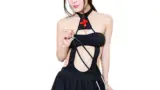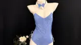 この衣装はスクール水着をモチーフにしたハイネックショートロンパースで、フロントジッパーを下ろすと深いVネックが生まれる大胆なデザインです。丈は太もも上のショート丈、ノースリーブのホルターネックで背中は広く開くバックレス寄りの作りです。全体は体に沿うタイトシルエットでバストとヒップを強調し、伸縮性のある滑らかな生地がフィット感と光沢を演出します。股下に開閉可能なジップ仕様があり、撮影やコスプレイベント、パーティーやプライベート撮影でアクセサリーやソックスと合わせて楽しめる一着です。