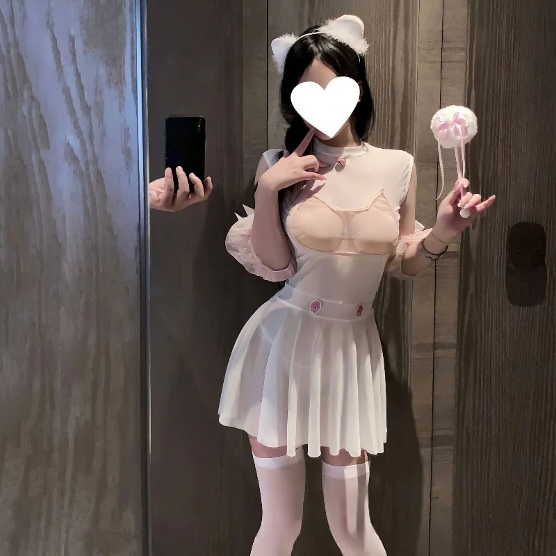 この衣装は猫耳を合わせたネコミミ系のコスプレ衣装です。ハイネックのボディにシースルー素材を重ね、胸元は猫の顔を思わせるカットアウトと成形カップで立体感を出したデザインになっています。袖は取り外し可能なふんわりチュールのパフスリーブ、ウエスト位置は高めで小さな花モチーフのベルトがアクセント、裾はプリーツのミニスカートで動きに合わせて広がるフェミニンなシルエットです。付属の猫耳カチューシャ、ベル付きチョーカー、ポンポンのステッキ、ニーハイ風ソックスで統一感を持たせ、透け感とボディラインの強調で程よい肌見せを楽しめます。イベントやコスプレ撮影、パーティー、室内撮影などで映える一着です。
