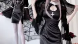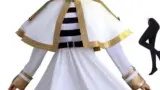 この衣装は、立ち襟を持つホルターネック型のクロップドトップと、ボリュームのあるフレアミニスカートを組み合わせた秘書風コスチュームです。トップは胸元が大きく開いたキーホールデザインで、内側にレーストリムが覗く仕立てと中央の細リボンで視線を集めます。背中は大胆に開いたバックレス仕様で、ウエスト周りはタイトに仕上げているため、上半身のフィット感とスカートのふんわりしたメリハリが際立ちます。スカートは二重構造の裾ラインで動くたびに広がり、サテン調の小さなリボンやパイピングがアクセントになっています。付属のガーターストラップ風リボンとニーハイの組み合わせで足元を華やかに演出し、撮影やイベント、テーマパーティーやプライベートなロールプレイなど、写真映えと動きやすさを両立したシーンで活躍します。