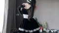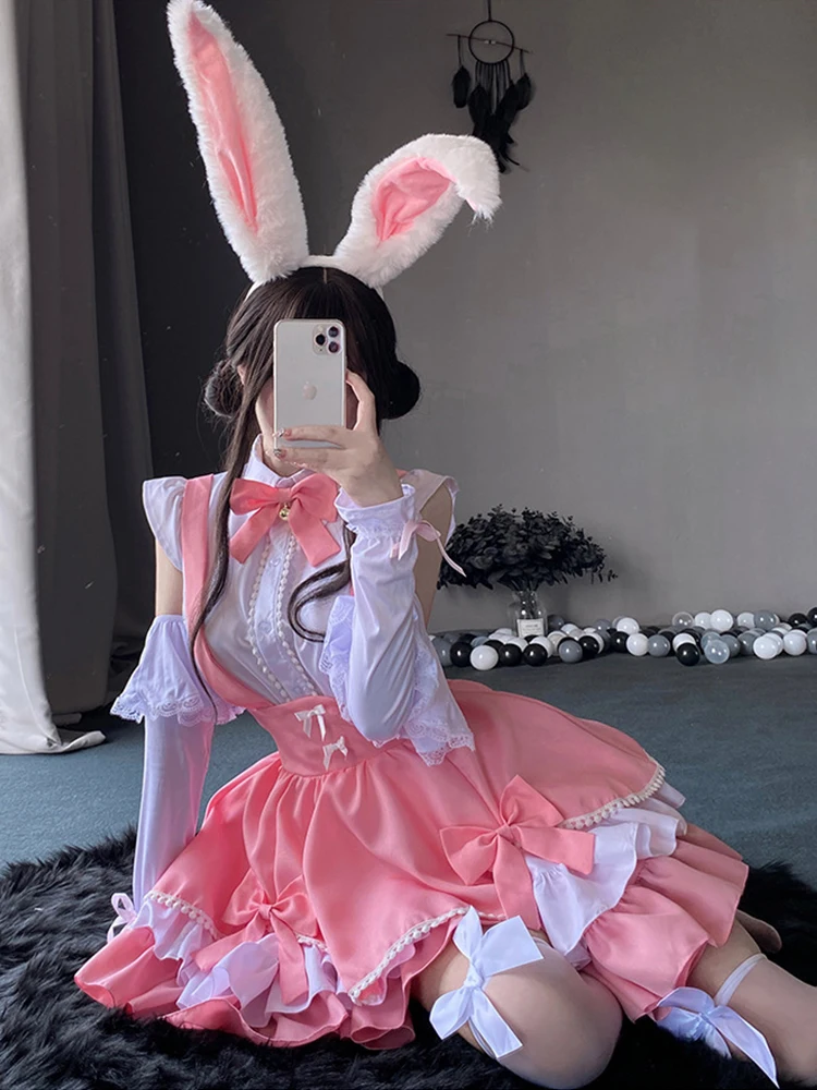 この衣装はバニー要素を取り入れたガーリーなサスペンダー風ドレスセットです。ミニ丈のフレアスカートは多段フリルとパール風の縁取り、大小のリボンが散りばめられ、ふんわりしたAラインで可愛らしいシルエットを作ります。トップはハイカラーにボウタイ、肩のカットアウトとサスペンダーストラップが特徴で、取り外し可能なロングアームカバーはレーストリムで華やかさをプラスします。素材は光沢のある生地と薄手のフリル生地の組み合わせで、柔らかな光を帯びた質感が撮影映えします。付属のウサミミカチューシャや太めのリボンガーター、ニーハイと合わせれば統一感のあるコーディネートに仕上がり、イベントやコスプレ撮影、パーティーでの目を引く一着として最適です。