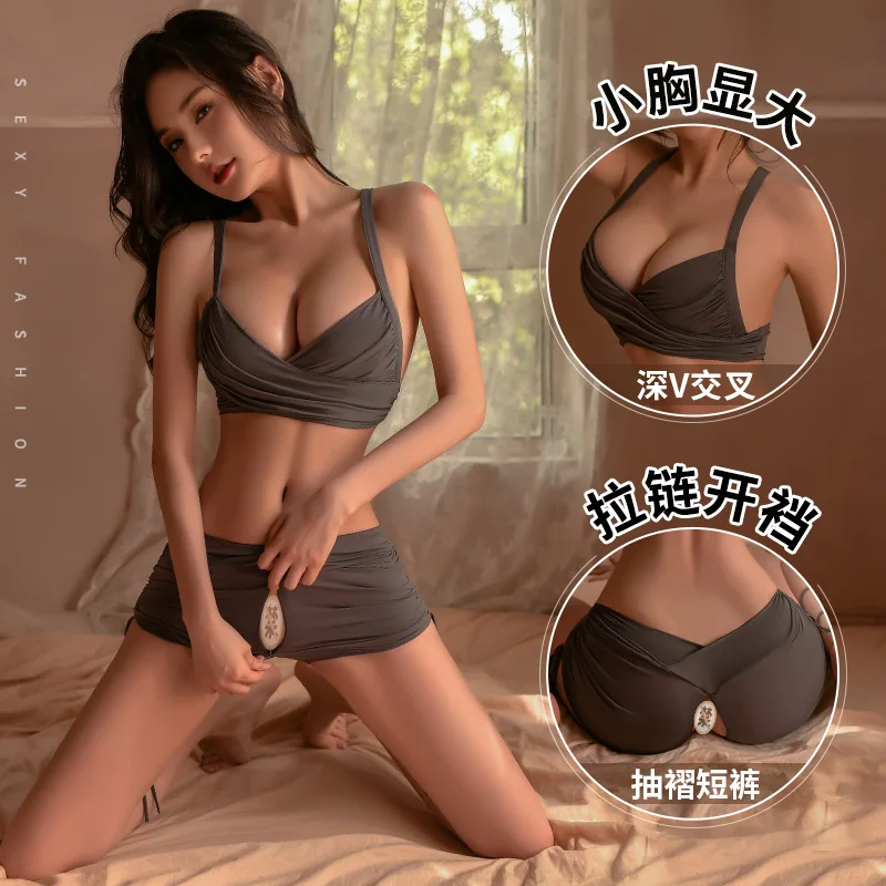 この衣装は、胸元を深くクロスして見せるショートランジェリーセットで、ブラトップとショートボトムの2点構成です。丈はミニ丈でノースリーブ仕様、深いVネックがバストラインを際立たせるデザインです。シルエットはボディに沿うタイト設計で、ウエストはV字に落ちるカットが脚を長く見せる効果があります。素材は伸縮性のある薄手のストレッチ生地で程よい光沢と滑らかな質感が感じられ、肌にフィットしてラインを綺麗に見せます。装飾はクロスラップのドレープと、両サイドに寄せたギャザー&ドローストリング、前中心に開閉できるジッパーなど実用的で視覚的なディテールが効いています。バックはストラップがX字に交差するバッククロス仕様で後ろ姿もシャープに演出します。付属品は特になく、タイツや小物でアレンジしやすく、プライベート撮影やボディラインを強調したイベント、コスプレ撮影などのシーンで映える一着です。
