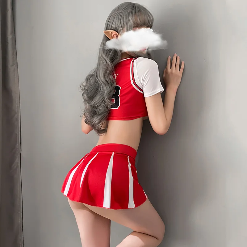 この衣装はスポーティーなチアリーダー風のセットアップで、ショート丈のクロップドトップとミニ丈のプリーツスカートがセットになったデザインです。トップはラウンドネックの短めスリーブでタイトに仕上げられ、胸元には“Basketball”のプリント、背面には番号ロゴがアクセントになっています。スカートはハイウエスト切替から広がる小さめのプリーツで、脚長効果と動きに合わせたふんわり感を演出します。素材は伸縮性のあるポリエステル系で光沢を抑えたしなやかな質感、白の差し色ラインやパイピングがスポーティーな印象を引き締めます。ニーハイやスニーカーと合わせた撮影やイベント、コスプレパーティーに映える一着で、ウエストや脚を強調するシルエットがポイントです。