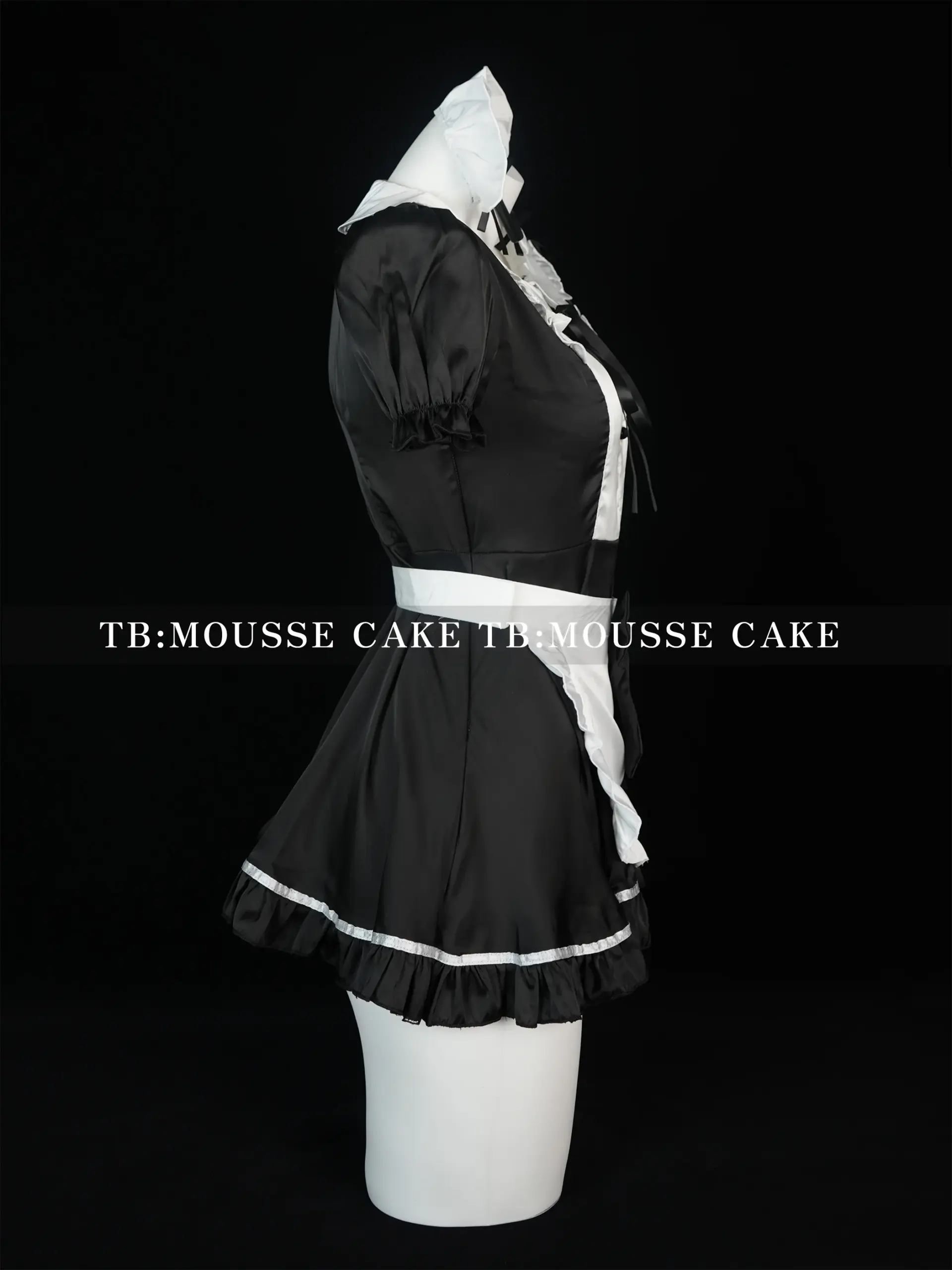 この衣装はクラシックなメイドスタイルをベースにしたミニ丈コスチュームです。丸みのあるピーターパンカラーに胸元のフリル付き前立てとリボンタイがあしらわれ、顔周りを華やかに見せるデザインです。パフスリーブの半袖で袖口はギャザー入り、ウエストを絞ったフィット&フレアのシルエットが脚線を強調するミニスカートへとつながります。光沢のある滑らかな生地感に細かなフリルトリムを施し、取り外し可能な小さなエプロンはギャザーと大ぶりの後ろリボンでクラシカルな趣を添えます。付属のヘッドピース(カチューシャ風メイドキャップ)と首元リボンで完成度が高まり、手袋やニーハイなどの小物と合わせることで印象を変えられる万能アイテムです。この衣装はコスプレイベント、撮影、テーマパーティー、ハロウィンなどで映える一着です。