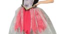 胸元はハートラインのストラップレス仕様で、上部に幅広い切り替えが入ったコルセット風のワンピースです。縦に入る細い配色ラインがパネルのように見え、ウエストを絞る立体的なシルエットを作っています。腰から下は短めのフレアスカートになり、裾は細い縁取りで始末されています。背中は帯状の切り替えで脇をすっきり見せ、セーラーカラーはネックに掛ける形で二本のラインが入っています。赤いスカーフを首元で結ぶデザインと、同モチーフの帽子(頭飾りのリボン付き)がセットされ、マリンモチーフを象徴する装飾が効いています。生地は表面が平滑でボディラインに沿うフィット感があり、全体に構築的でコスチューム性の強い仕立てです。