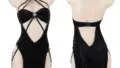 高めのチャイナカラーと繊細な装飾が印象的なブラ&ショーツのセットです。ブラは成形されたカップで胸元を立体的に見せるバルコネット風のカットを採用し、カップ縁とアンダーに配されたレースフリルが柔らかな縁取りを作っています。肩まわりには小さなフリルと花結びのチャイナボタン風飾りが配され、サテンリボンとタッセルが垂れることで装飾性を高めています。ショーツはローライズの台座に編み上げ風のリボンとレースを組み合わせ、サイドから伸びるシフォンのドレープが脚のラインに軽やかな陰影を与えます。ガーターストラップはショーツに接続され、太もも用のレースガーターには立体的な薔薇モチーフが縫い付けられているため、セットで見たときの統一感が強いデザインです。素材は光沢のあるジャカード調サテンと薄手のシフォン、繊細なレースを組み合わせた構成で、細部のリボン使いやタッセルがアクセントになっています。