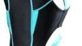 チャイナカラーの小さな留め飾りを持つハイネックと、大きく開いた前中心のカットアウトが特徴のボディスーツです。胸元から腹部にかけて細いストラップを格子状に組んだクロスデザインが入り、肌の露出を線でつなぐように視線を誘導します。両脇はソリッドな切り替えでウエストを引き締め、後ろはオープンバックでヒップラインを見せるハイレグカット。素材は伸縮性のある滑らかな合成繊維でフィット感が高く、ストラップ部分は薄手で繊細な作りになっています。付属の網タイツは太めの目のフィッシュネットにレーストップを組み合わせており、異なる素材感の対比が全体のバランスを作っています。取り扱いはストラップ部分が繊細なので優しく扱うことを推奨します。