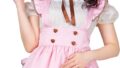 黒を基調に白い切替とパイピングで縁取ったチャイナドレス風のミニワンピースです。素材はやや光沢を抑えた伸縮性のあるジャージー調で、身体に沿うボディコンシルエットを作ります。胸元は深いVカットにギャザーとフリルを配し、首元の立ち襟と飾り紐(チャイナボタン)が伝統的な要素を残しています。肩は小さなフレンチスリーブで縁にレースをあしらい可憐さを添え、裾はミニ丈で両サイドに高めのスリットが入っています。背面のリボン留めや内側の細いストラップなど、隠す部分と見せる部分のバランスで視線を誘導するデザインになっています。