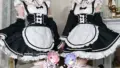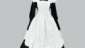 この衣装はクラシックなメイドスタイルをベースにしたコスプレドレスです。ひざ上のミニ丈スカートは広がるフレアシルエットで、裾にレースと花模様のトリムが施され立体感を演出します。肩はふんわりとしたパフスリーブ、襟元は立ち上がったハイネックに小さなキー開きが入り愛らしい顔周りを作ります。前掛け風のフリルエプロンは取り外し可能で、ウエストで大きなリボンを結ぶ仕様。黒地に浮き出る織柄と程よい光沢、白いフリルのコントラストが上品さを引き立て、胸元に垂れる赤い房飾りや金のタッセルと鈴がアクセントになります。イベントや撮影、パーティーでの定番コスチュームとして、クラシカルで可憐な印象を与えます。