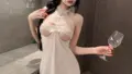 この衣装はチャイナドレスを現代的に解釈したランジェリー風のデザインで、立ち襟と胸元の抜けが組み合わさった印象的なシルエットが魅力です。この衣装はミニ丈でハイレグに近いスリットとサイドの大きなカットアウトにより脚部とウエストラインを強調します。この衣装はノースリーブでタイト寄りのフィット感ながら、胸元はシアー素材に繊細な刺繍が施され透け感と装飾性を両立させています。この衣装はベルベット調の柔らかな光沢と伸縮性のある生地を組み合わせ、肌当たりの良さと上品な艶を演出します。この衣装は小さなチャイナ釦や花モチーフの刺繍、胸元の鍵穴開口など細部のディテールがフェミニンなアクセントになっています。この衣装はイヤリングやヘアピン、ストッキングやヒールと合わせることで撮影やプライベートなパーティー、コスプレイベントで映えるコーディネートになります。