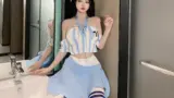 この衣装はスチュワーデスをモチーフにしたミニ丈のコスプレセットです。深く開いたVラインの胸元はレーストリムで縁取りされ、中央の開きが大胆にデコルテを見せるデザインになっているため、女性らしいボリュームとラインを強調します。肩から肘にかけての五分袖はほどよい露出感を残しつつ上品さをキープし、首元には透け感のあるシフォンのスカーフが付いてアクセントになります。ウエストは高めに切り替えられたタイトなミニスカートで、ヒップラインに沿うフィット感とサイドの小さなスリットが動きに色気を添えます。付属の小ぶりな帽子でコスチュームのテーマ性を強め、パーティーやコスプレイベント、ポートレート撮影やプライベートな撮影シーンで映える一着です。