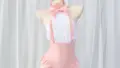 白いチュールを幾重にも重ねたミニチュチュスカートと、赤みのあるピンクのシースルーコルセットが組み合わさったナース風コスチュームです。コルセットはアンダーワイヤー入りのバルコネットカップと縦方向のボーンで立体感を出し、中央には透けるレースパネルと小さなリボンを配してフェミニンに仕上げています。カップはドット模様の薄手メッシュで、縁には白いフラワーレースを重ねてコントラストを作っています。ウエストは絞りでメリハリがつき、腰位置でふんわり広がるチュールはバレエスカートのような丸みを出します。腕には透け感のあるロンググローブ、脚は太めの白ニーハイでまとめ、付属のナース帽には赤い十字のワッペンが付いてテーマ性を補強しています。全体は軽やかな透けとボリュームの対比で、かわいらしさと少しの挑発性を併せ持つデザインです。