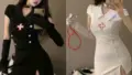 この衣装はナースモチーフのコスチュームで、ハート型のエプロンに十字ワンポイントを配したデザインです。ミニ丈のフレアスカートは裾にラインが入り、ウエストはベルト風タブで引き締めるつくり。オフショルダーのパフスリーブとホルターネック、同布のチョーカーで首元にアクセントが付き、背面はファスナーでフィット感を確保。サテン調の光沢ある生地と細かなフリル使いが立体感を生み、ニーハイ風タイツやヘッドアクセを合わせれば撮影やイベントで映えるトータルコーデが完成します。