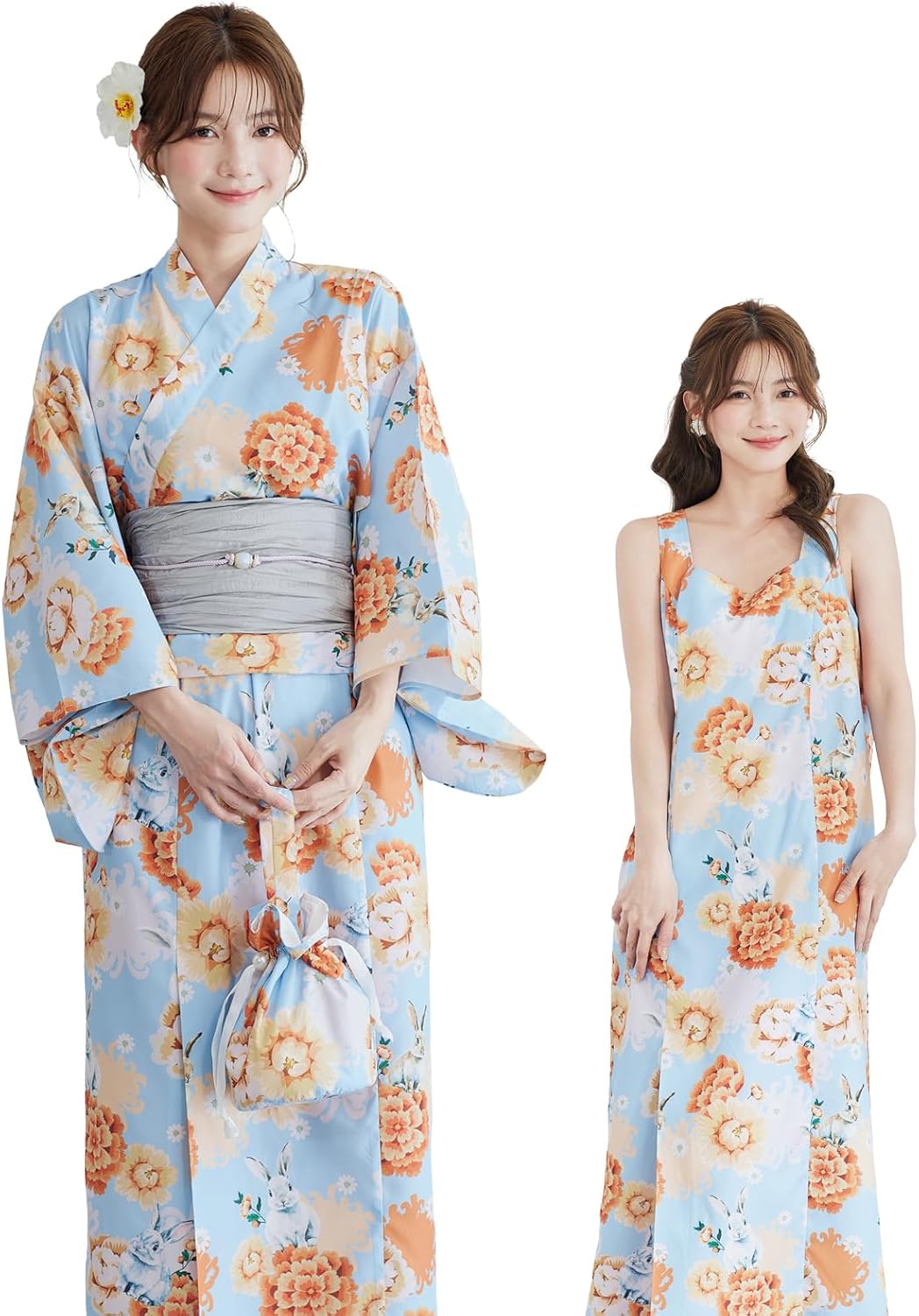 [Malymoon] 浴衣 ワンピース 2way 花柄 花 青 オレンジ バニー うさぎ 衣装 仮装 マリームーン 4点セット YK2510323