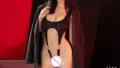 一体型のボディスーツで、胸元とソ腰部に大胆なカットアウトを配したデザインです。首元はホルターネックで、背面は大きく開いたローラインに仕上げられており、ヒップラインはハイレグで強調されます。素材は滑らかで伸縮性のあるスパンデックス系と思われ、身体に沿ってタイトにフィットします。縁にはパイピング処理が施され、カットアウト周りや脚ぐりを際立たせています。付属のチョーカーは同素材のエラスティックベルトにボーン型チャームがぶら下がる仕様で、テーマ性を補強します。視覚的なインパクトは強く、装飾性と露出のバランスを重視した見せ方が主眼ですが、ホールド感や実用的なサポートは限定的なので、見せる用途が中心のアイテムです。