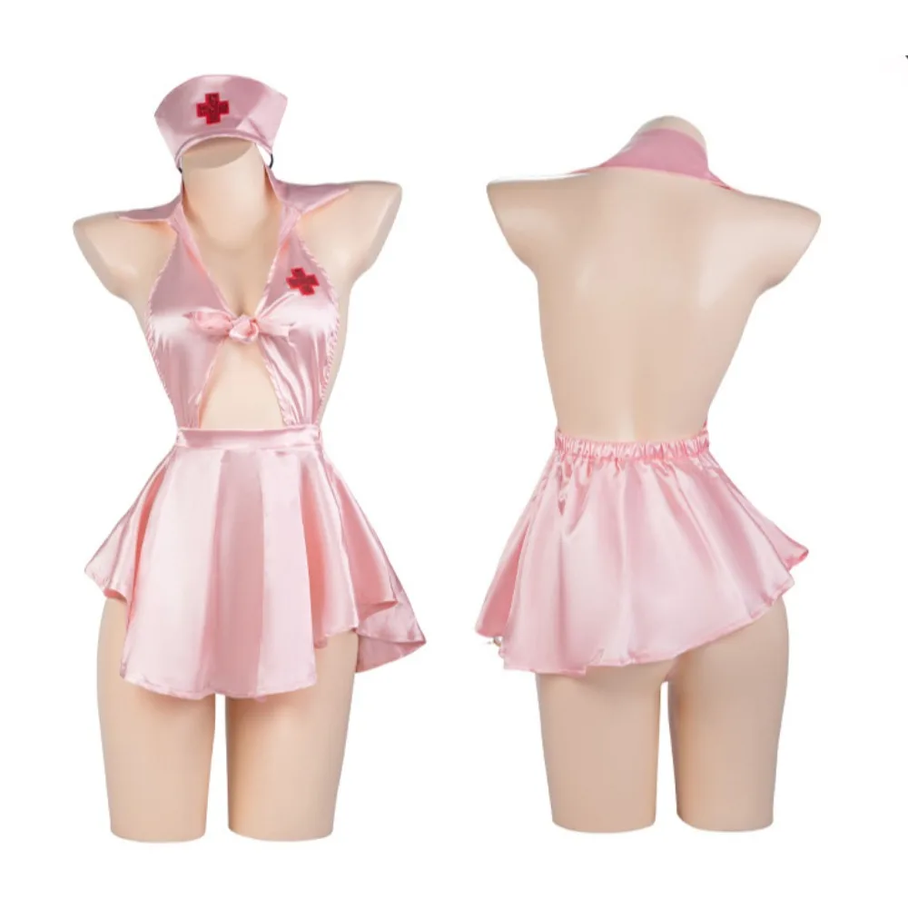 薄手のピンクサテンで仕立てられたナース風ランジェリーです。ハルターネックから胸元へ深く開いたVカットは、パッドやワイヤーの入らないソフトなカップラインで身体に沿う設計になっています。中央のリボン結びが開きを調整するアクセントとなり、胸の片側には赤い十字ワッペンがコスプレ性を強めています。ウエストはゴム仕様のミニフレアスカートで、後ろは大胆なバックレスに仕立てられてヒップラインを際立たせます。付属はミニナースキャップとTバック風ショーツで、光沢のあるサテンが肌のラインを柔らかく映します。縁は細いパイピング風の始末で裾に動きが出るデザインです。見せ方の“間”を重視した構成で想像を掻き立てますが、サテン素材特有の滑りやすさや透け感、サイズ選びによるフィット感の差には注意が必要です。