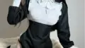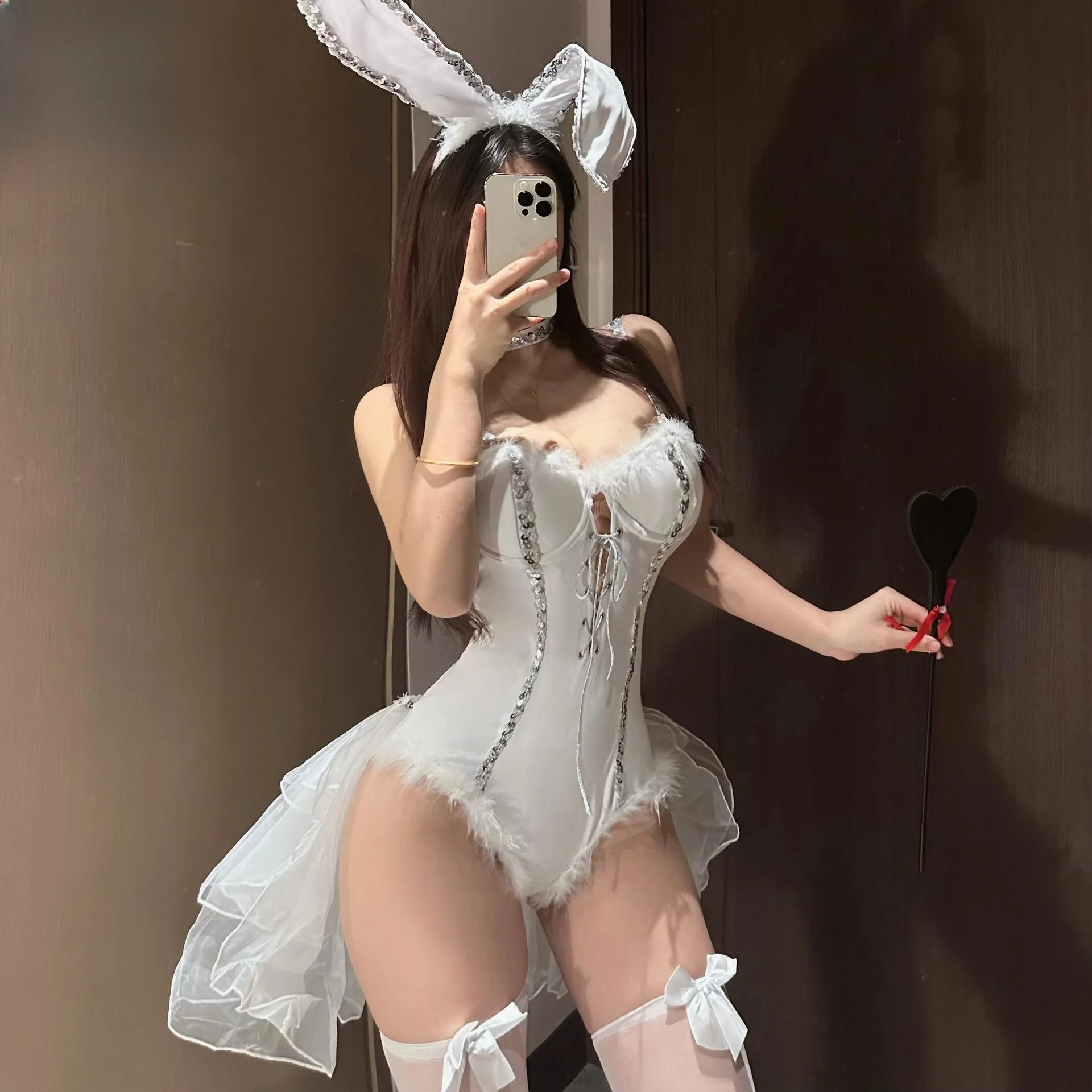 成型カップとボーンの効いたコルセット型ボディスーツです。胸元は中央の小さなカットアウトと編み上げで視線を誘導し、カップ縁と脚ぐりには柔らかいフェザートリムがあしらわれています。胴は縦に入ったライン装飾(スパンコール状の縁取り)で強調され、腰からはふんわりとした多層オーガンジーのオーバースカートが流れるように付属。細い調節可能なストラップ、チョーカー、カチューシャのバニー耳、太ももに留まるガーターストッキングと大きなリボンがセット感を作っています。背面は中央閉じの仕様でウエストをしっかり絞る構造です。見たままの質感と装飾を生かした、構築的でフェミニンな一着です。