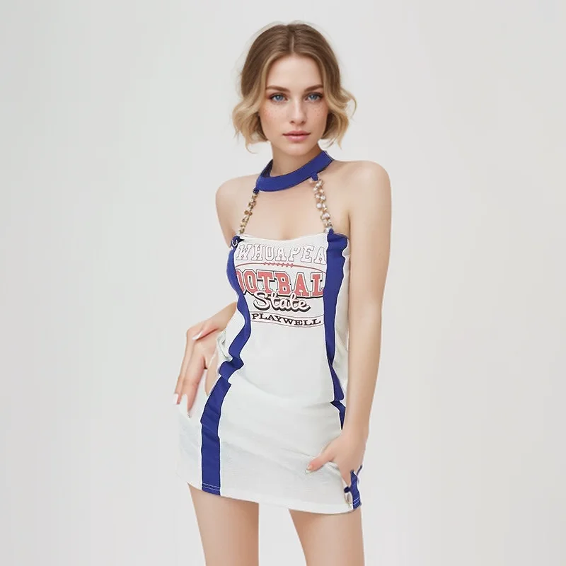 商品名 | 韓国版 スリムでセクシーな文字プリント バックレス ワンピース チェーン付きホルターネック レディース 2024 |
