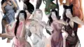 このランジェリーはチューブ状のバンドゥトップと細長いフロントパネルを組み合わせた一体型デザインです。主素材は伸縮性のあるフローラルレースで、薄手のシースルーが肌のラインを柔らかく透かします。バストはオープンカップ風にカットされ、下側から支える構造でボリューム感を演出します。両脇はサテンリボンで結ぶ仕様になっており、サイズ調整と視覚的アクセントを兼ねています。バックはほぼバックレスで、ヒップはTバックにつながるハイレグカットのため腰まわりのシルエットが強調されます。縁はスカラップのレースで仕上げられ、全体に軽やかで繊細な印象を与える構成です。