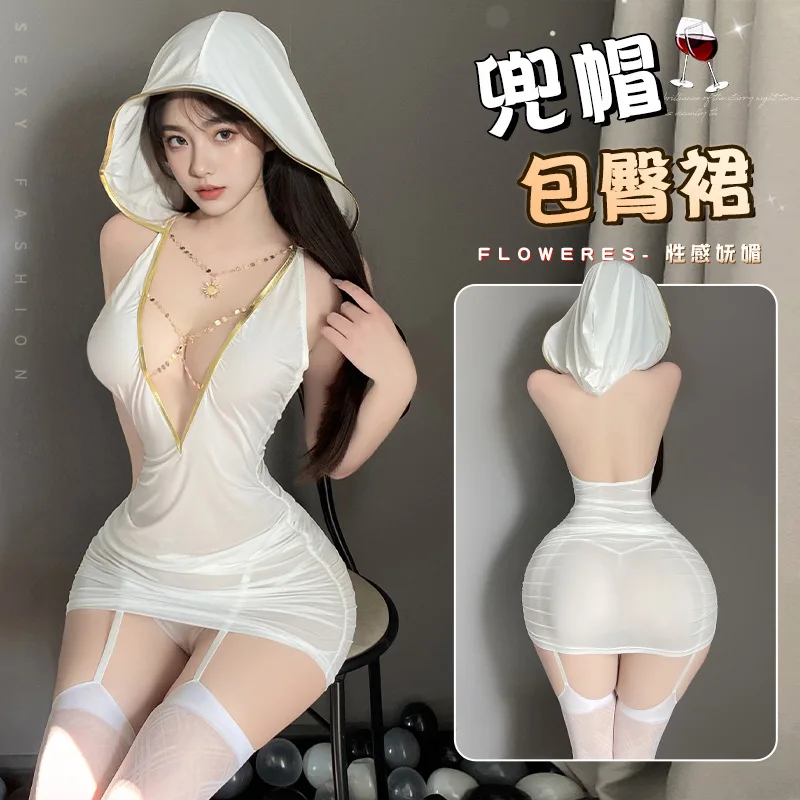 フードを備えた一体型のミニドレスです。肩を覆わないホルターネックで深く切り込んだVネックは、縁にメタリックトリムが走りラインを強調しています。背中は大きく開いたバックレスでウエスト位置からスムーズに張り付くボディコンのシルエットを作り、腰〜ヒップは横方向に寄せたギャザーで丸みを出しています。素材は薄手で光沢を帯びた伸縮性のある生地が用いられ、やや透け感があります。裾下からはガーター(ガーターストラップ)が伸びてストッキングと接続する構造で、胸元にはチェーン状の装飾(商品画像では付属として見える)とTバックの下着がセットされています。全体は体に沿うタイトなカッティングで、フードやメタリックトリム、チェーンといった装飾がアクセントになっています。