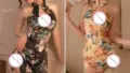 フード付きのショートトップと極小ブラ、片側に大胆なカットアウトを設けたミニスカート、そして太ももまで届くシアーストッキングを組み合わせたセットです。トップは首元からフードへ続く一枚布のような作りで、アンダーは紐でバックタイするシンプルな仕様。スカートは片側が開いたアシンメトリーなカットアウトを持ち、端は細かなレーストリムで縁取られています。カット部分は編み上げ(レースアップ)で締め具合を調整でき、長く垂れる紐が装飾的な動きを生みます。素材は伸縮性のある薄手のジャージ系で体に沿うフィット感があり、ストッキングは薄手のシアー素材で脚線を見せる設計です。露出と隠蔽のバランスを意識した構成で、身につける人のラインを強調しつつ編み上げでサイズ調整がしやすい作りです。