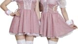 ベルベット調の柔らかな生地を用いたチューブトップワンピースです。胸元はハートラインに近いカットで、フェイクファーの縁取りがふわりと乗り、前面に配置された大きめのポンポンが縦ラインのアクセントになっています。ウエストで引き締めて裾に向けて広がるフレアミニスカートは、二重に重ねた裾に繊細なレーステープを配して軽やかなボリュームを生み出しています。背面には大きなサテンリボンが視覚的なアクセントとなり、腰まわりにメリハリを与えます。付属のロンググローブは手首にフェイクファーのカフが付き、指の部分が開くデザインで、ヘッドバンドの立ち上がったウサギ耳は内側にもファーが貼られているのが確認できます。網タイツ(ニーハイ風)のレーストップと組み合わせた脚線の見え方、光を受けてやわらかく艶めく素材感、そしてもこもこのトリムが季節感と遊び心を強く演出しています。