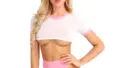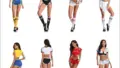 短めのクロップトップとローライズのショートパンツからなる2点セットです。トップは浅めのVネックと短い袖丈で、胸元にダメージ感のある「00」ナンバープリントが大きく入っています。身頃は体に沿うフィットカットでウエストラインと腹部の露出を強調し、袖やパンツのサイドに入るストライプがスポーティな印象を与えます。パンツは前中心にレースアップの紐が通り、幅のあるウエストバンドと裾のパイピングで輪郭を整えています。素材は光沢のある薄手のストレッチ合成繊維で、伸縮性を活かしたフィット感と動きやすさを両立しています。複数色のカラーバリエーションでユニフォーム風のモチーフを展開している点も確認できます。